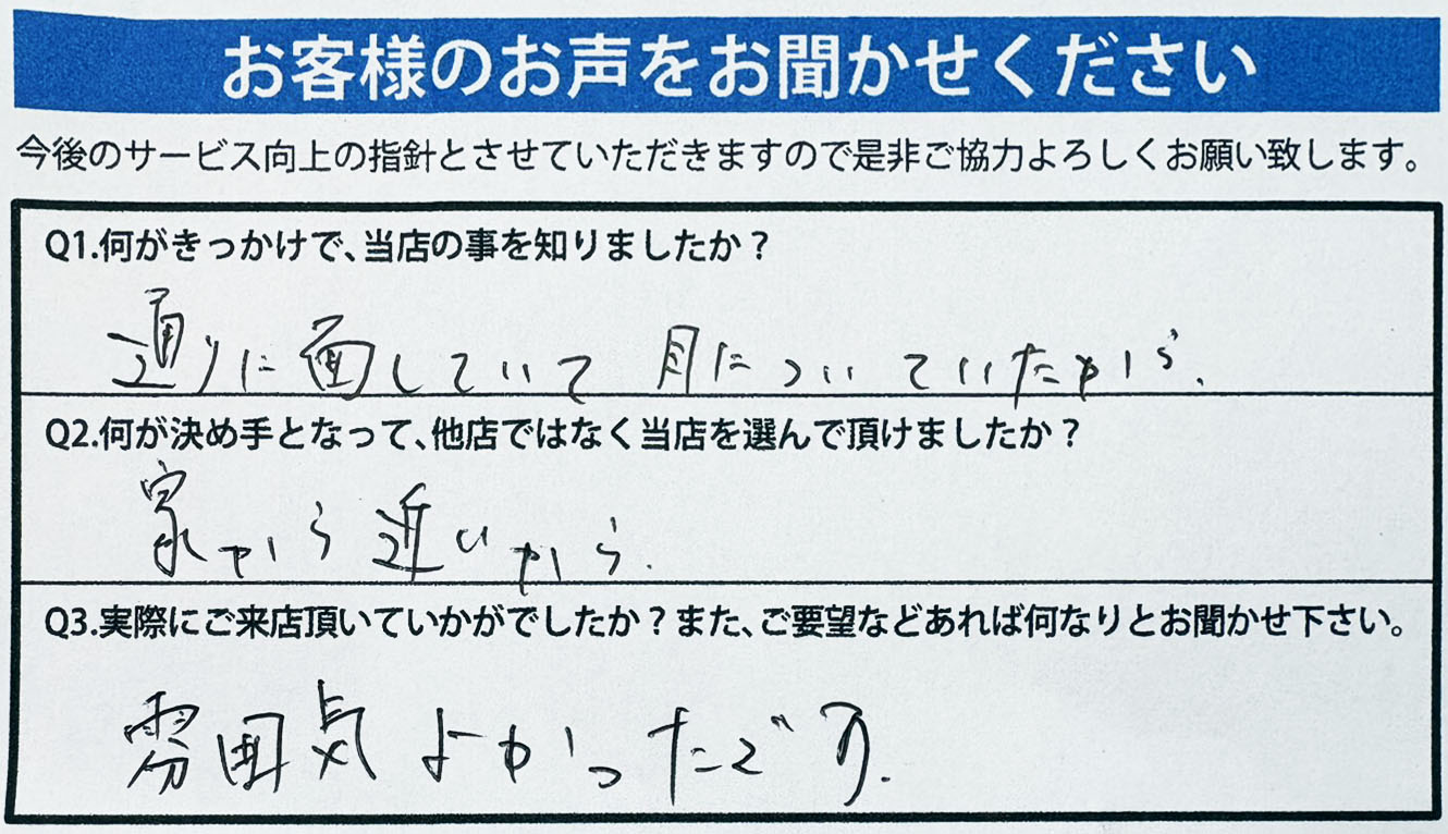 A.店員さんが優しく、明るい表情で迎えてくれて安心感がある。こちらの事情も慮って対応して頂き助かった。ありがとうございます。