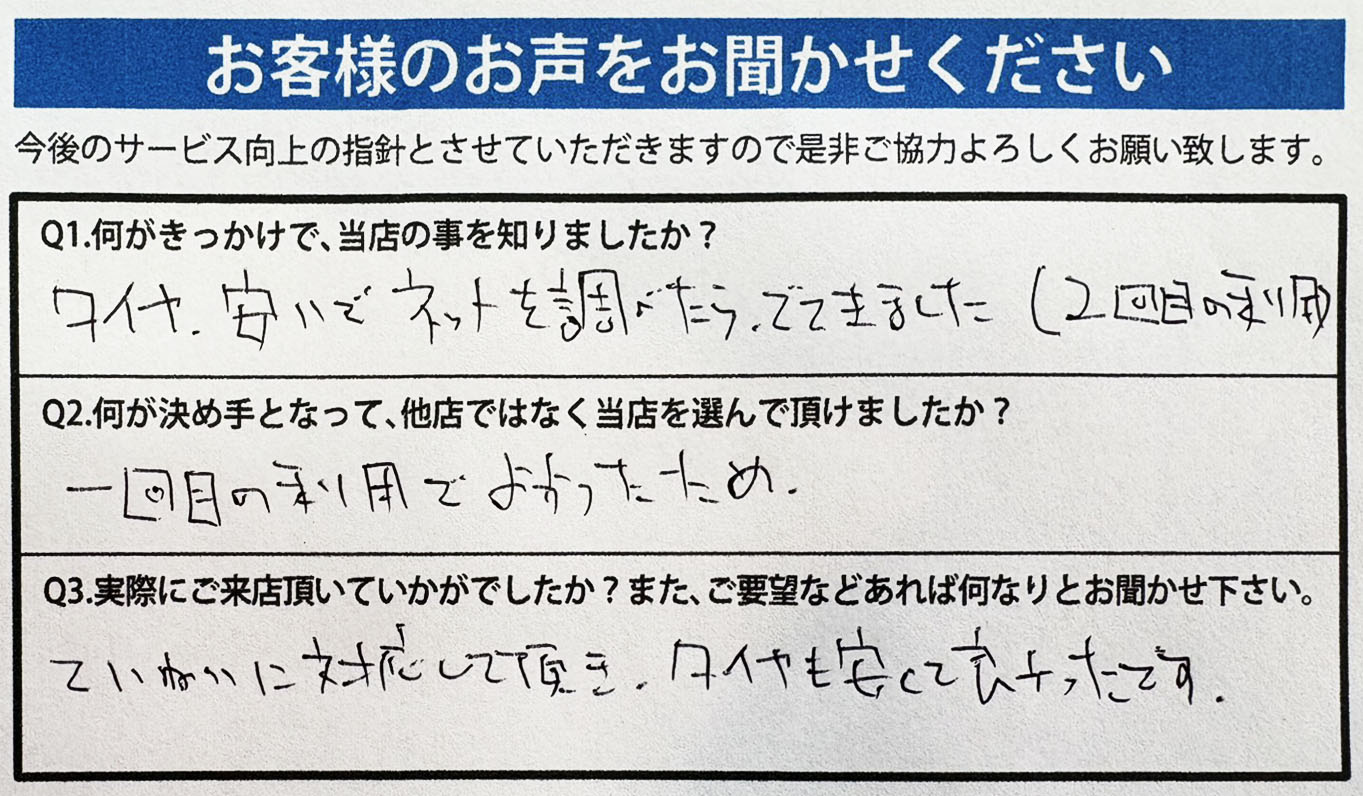 A.以前、タイヤを購入した時に料金も安くてサービスがよかったので