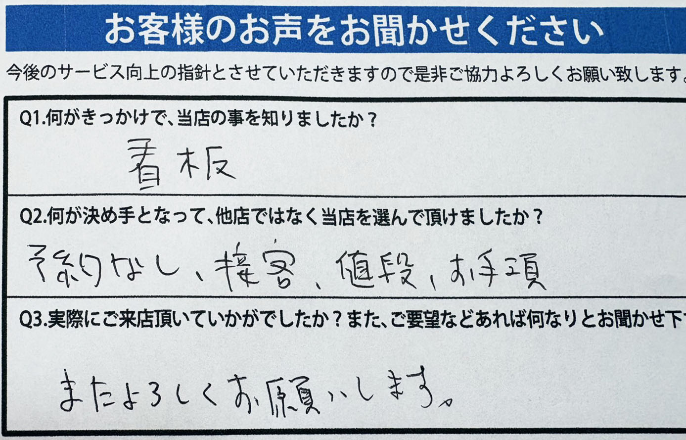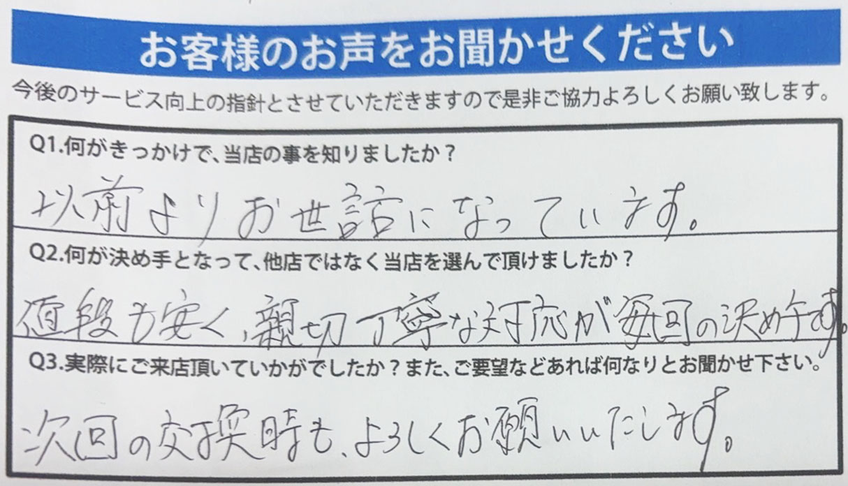 A.値段も安く、親切丁寧な対応が毎回の決め手です。