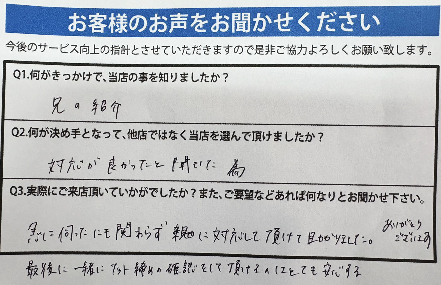 Q3.実際にご来店頂いていかがでしたか?また、ご要望などあれば何なりとお聞かせ下さい。