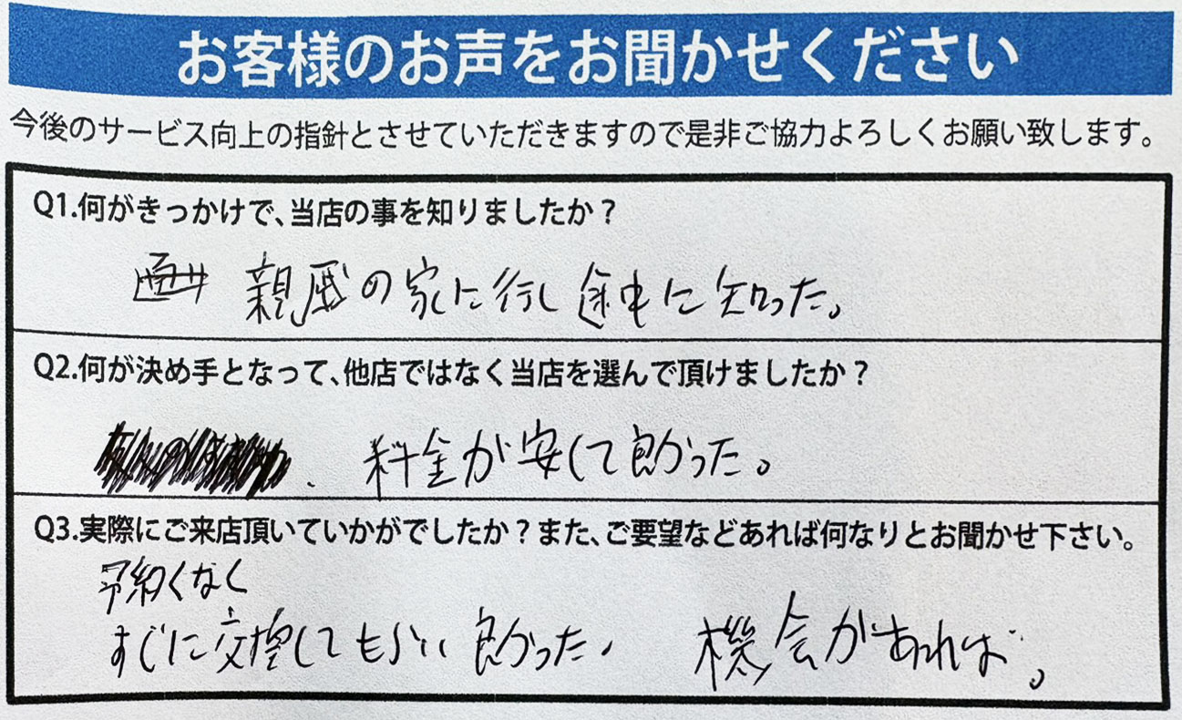 A.予約なく、すぐに交換してもらい良かった。機会があれば。