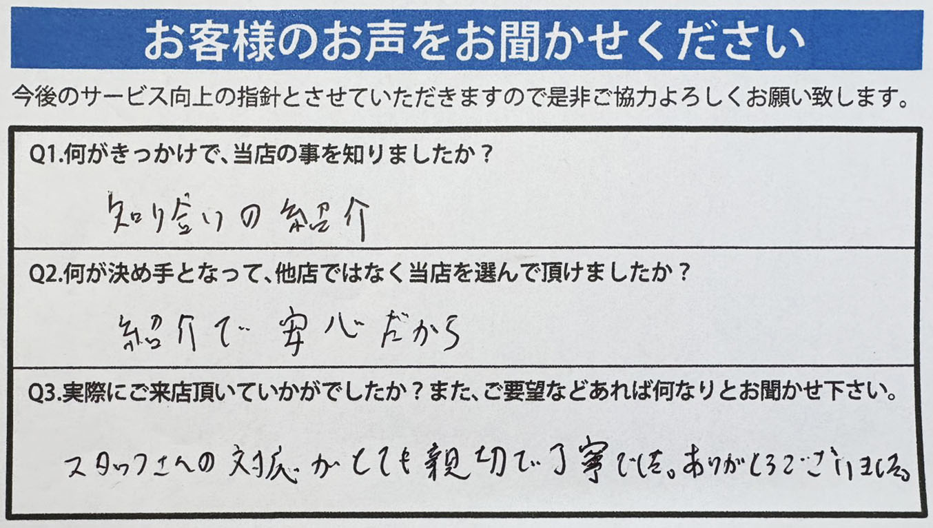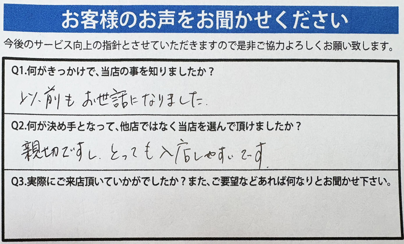 A.店員さんが優しく、明るい表情で迎えてくれて安心感がある。こちらの事情も慮って対応して頂き助かった。ありがとうございます。