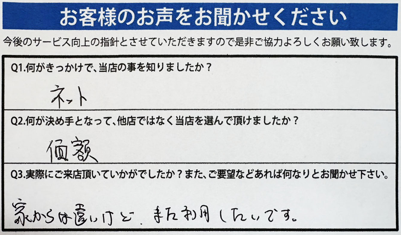 A.値段も安く、親切丁寧な対応が毎回の決め手です。